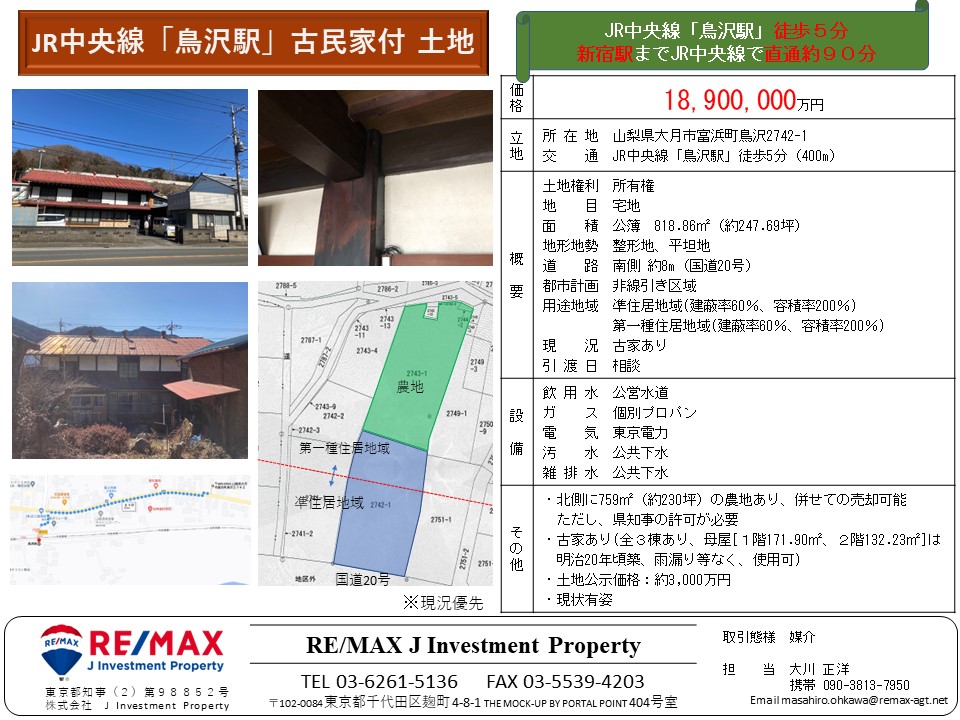 大月市鳥沢駅の徒歩圏に古民家、畑、山林などを複数預かっています。JR中央線が使えるため都心からのアク […] -