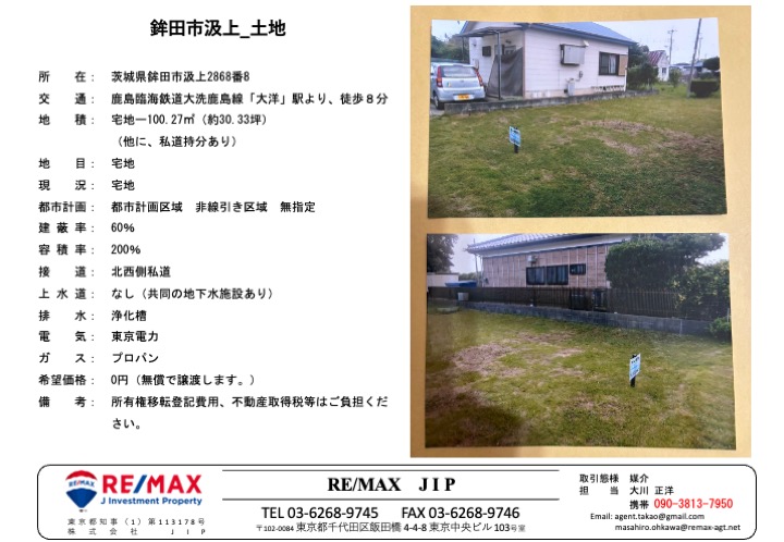 大洗鹿島線「大洋駅」徒歩8分の土地を無償で